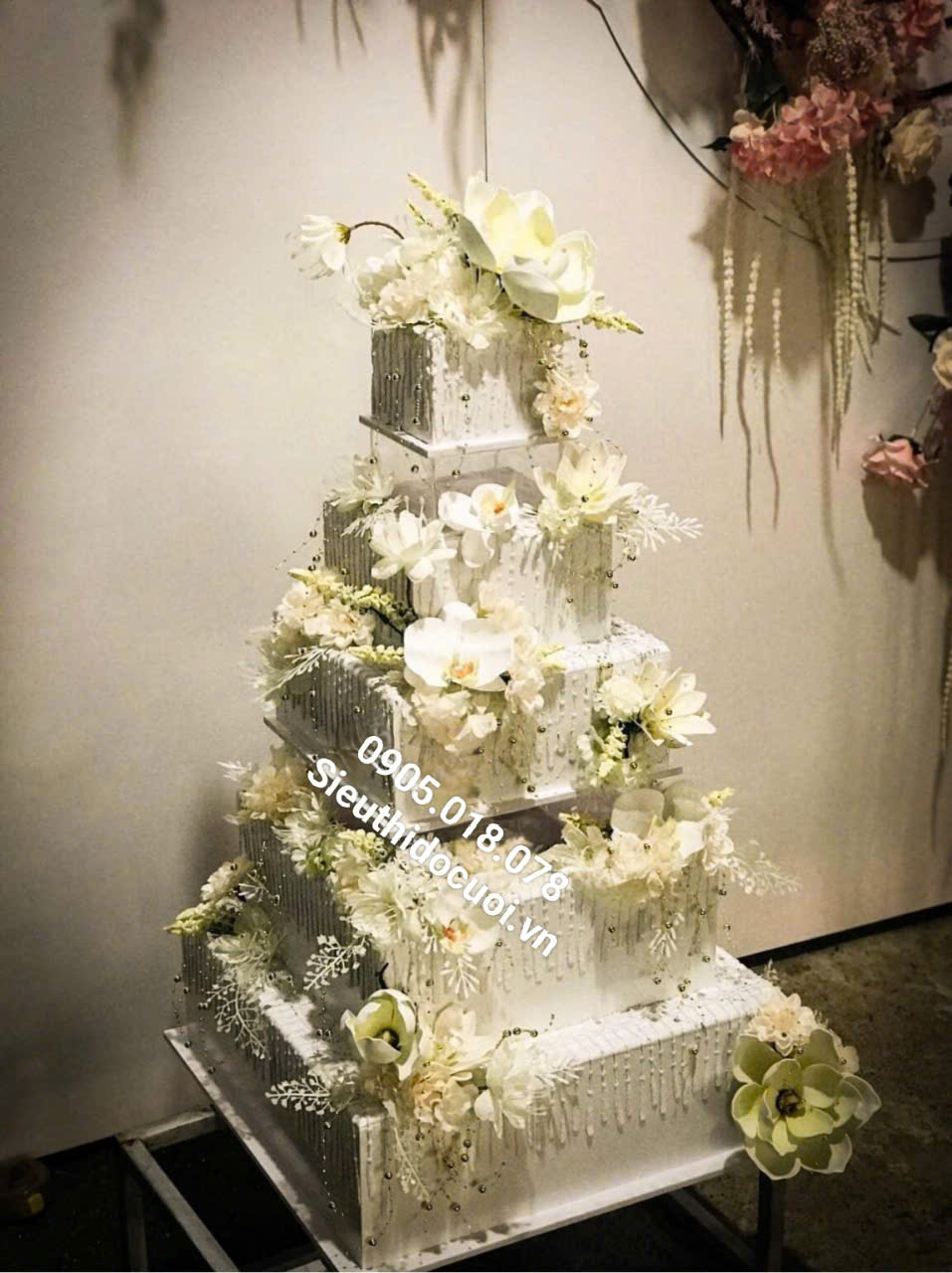 BÁNH KEM GIẢ CAO CẤP - Kích thước: Cao 80cm – Size vuông: 45cm - Chất liệu: mecal trong, fomex màu bóng - KT Modun: KHỐI - Phụ kiện: hoa lụa cao cấp & cườm vàng - Mua BÁNH KEM GIẢ CAO CẤP - LH: 0905018078