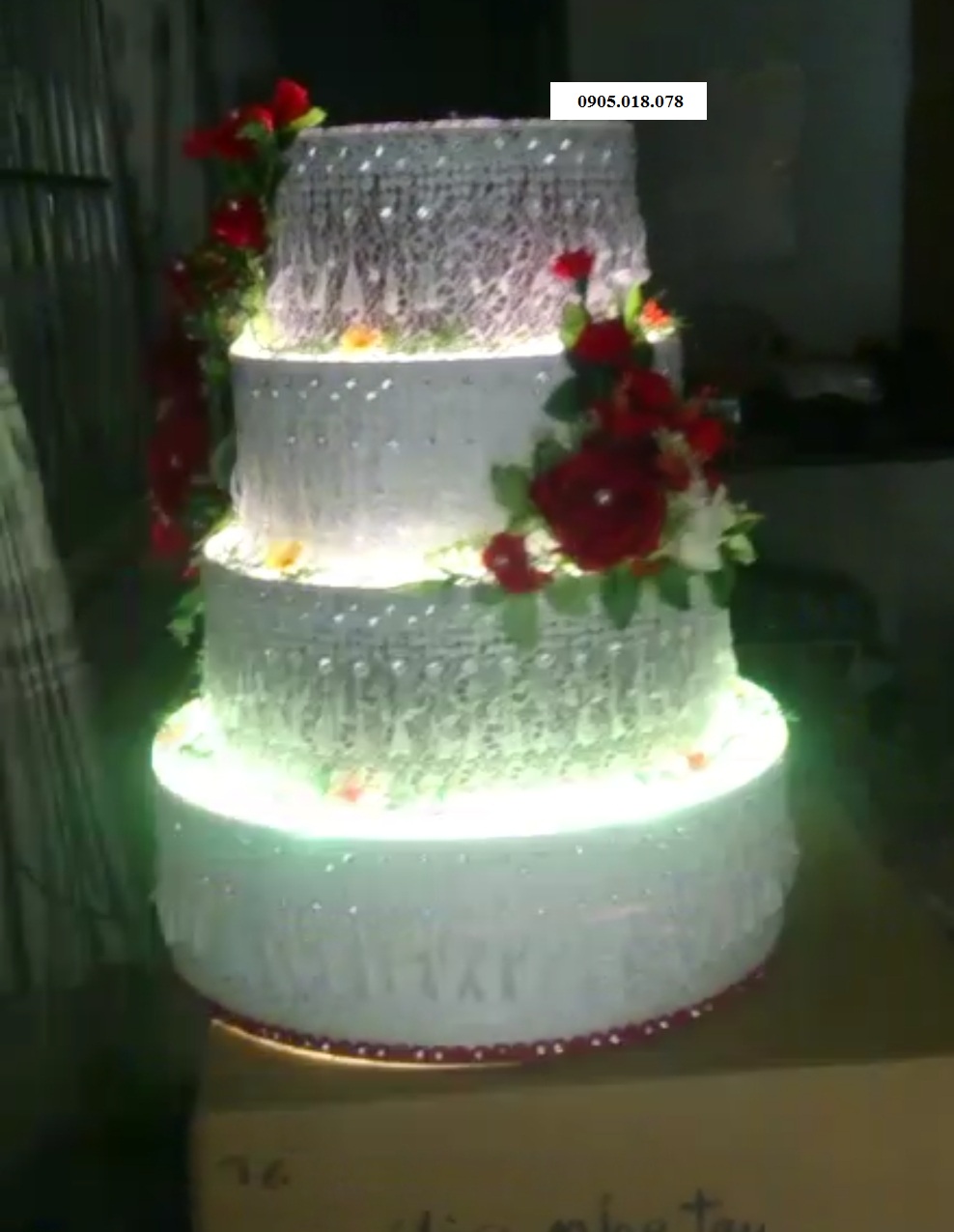 Với sự tinh tế, sang trọng và tiện lợi, chúng tôi sản xuất ra loại bánh kem trnag trí có đèn led xoay chiều, nhiều màu, chọn màu bằng điều khiển từ xa; bánh có thể xoay được tạo sự khác biệt, khi Cô dâu, Chú rể cắt bánh thì có điều khiển từ xa để chọn chế độ xoay, hay không xoay. Đây là dòng sản phâm cao cấp nhưng giá thật sự mềm so với thị trường Việt Nam hiện nay. Hay gọi chúng tôi để có giá tốt nhất 0905018078.