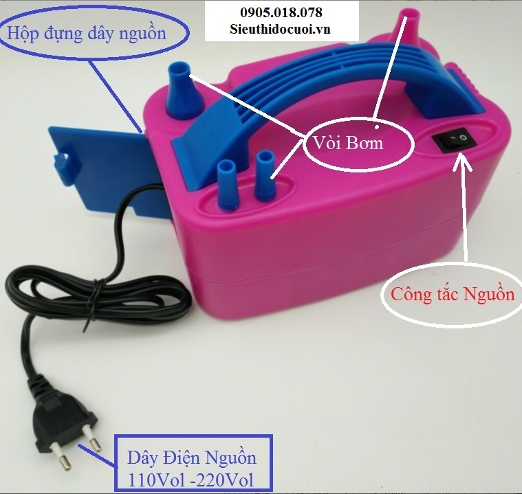 * Hai vòi chính để bơm bóng * Hai vòi phụ là phụ kiện để gắn vào vòi lớn để bơm bong bóng cỡ nhỏ
