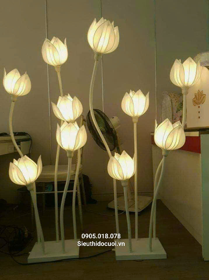 Đèn dẫn lối đám cưới hoa sen với một trụ có 5 bông hoa sen chính giữa có bóng đèn led ánh sáng màu vàng nắng, tạo không gian trang trí ấm cúng, sang trọng, độc đáo.