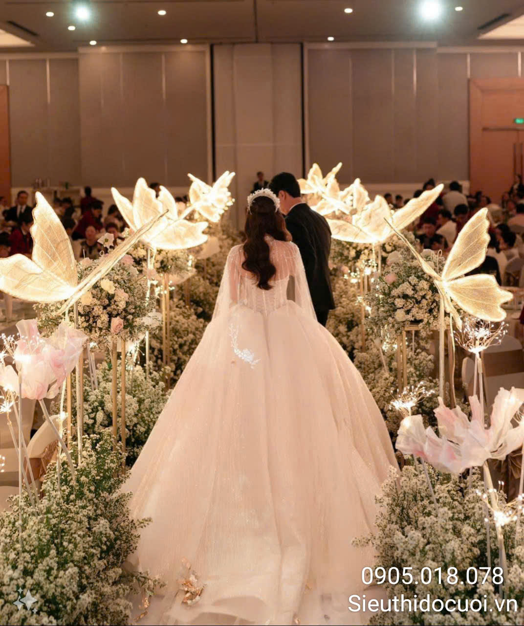 Đèn dẫn lối sân khấu đám cưới bướm led lớn là sự kết hợp tinh tế giữa đèn led và chất liệu sợi vải diệt thủ công, cùng sườn cánh bướm tạo hình uốn lượn giống thật tạo ra một sản phẩm trang trí thu hút và hiệu quả cao trong decor.