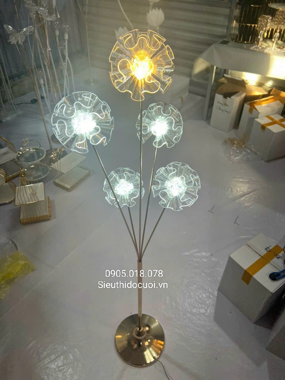 Chất liệu: Đế, thân bằng sắt mạ xi vàng; hoa bằng nhựa trong suốt