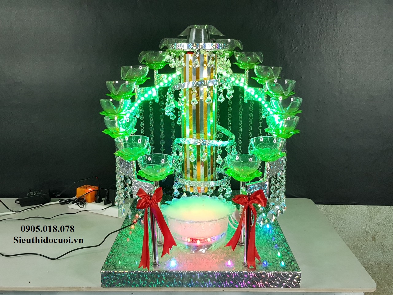 Kích cỡ: Đường kính đáy 50x55cm, cao 65 cm, với 17 ly, trục giữa xoay rất đẹp, có cặp thiên nga thủy tinh chính giữa rất sang trọng, đế bằng inox hình vuông có gắn đèn led sáng lung linh.