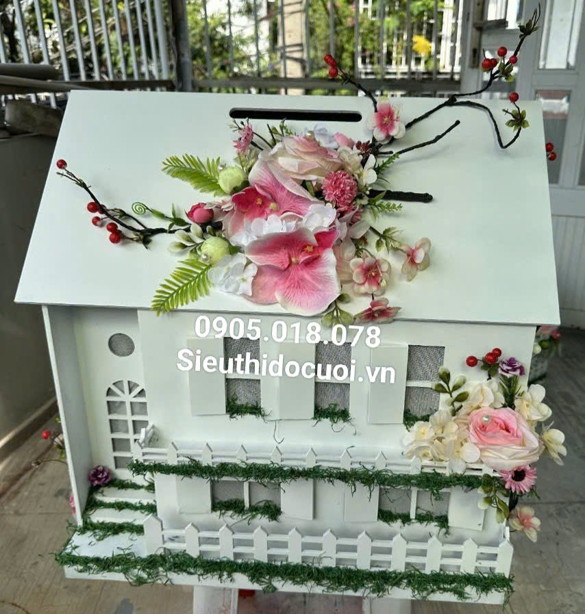 Thùng tiền đám cưới hình ngôi nhà với 3 màu nhã nhặn. Chứa trên 600 thiệp Mua thùng tiền đám cưới hình ngôi nhà. LH: 0905018078
