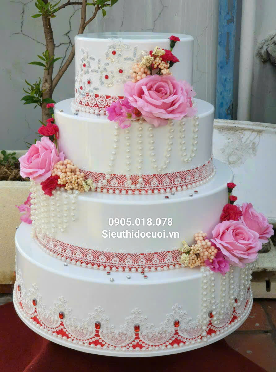 Thùng tiền đám cưới hình bánh kem 4 tầng - Chất liệu gỗ - Cao 60cm (mỗi tầng 15cm), đáy: 25cm, 35cm, 45cm, 55cm. - Đính hoa lụa cao cấp - Nguyên khối dính liền - Mua thùng tiền hình bánh kem 4 tầng - LH: 0905018078